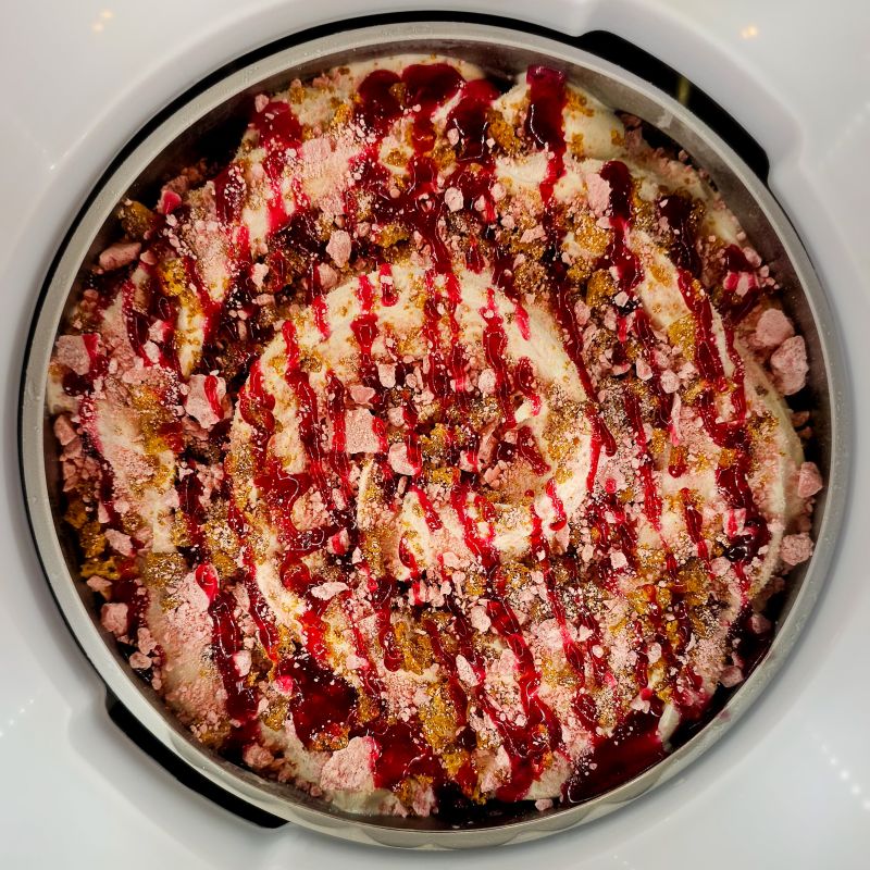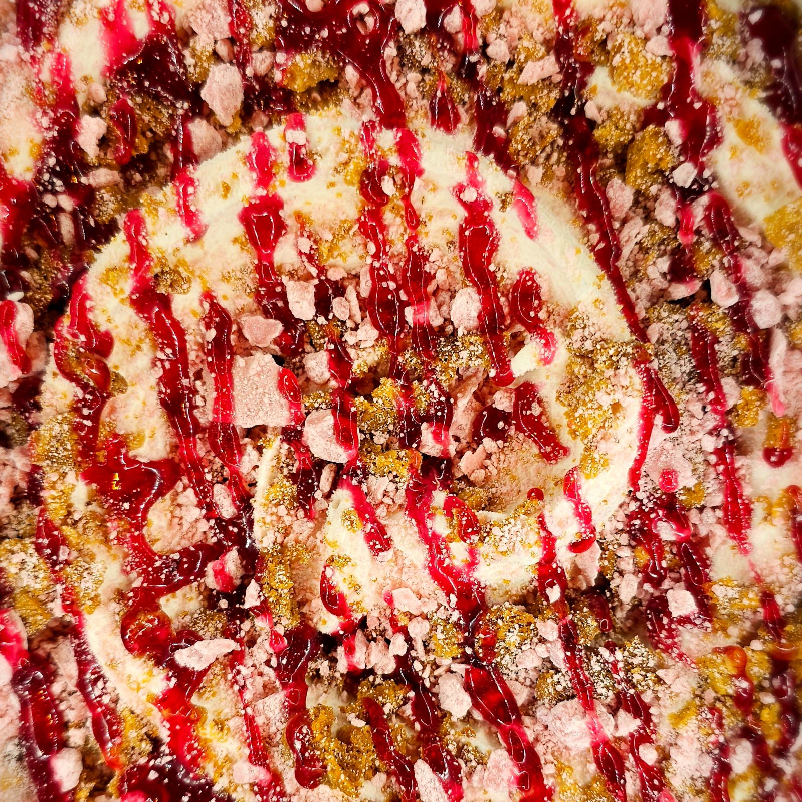 Una base aterciopelada de fino chocolate blanco aromatizado con chocolate de frambuesa y enriquecido con trozos de galleta blanca.