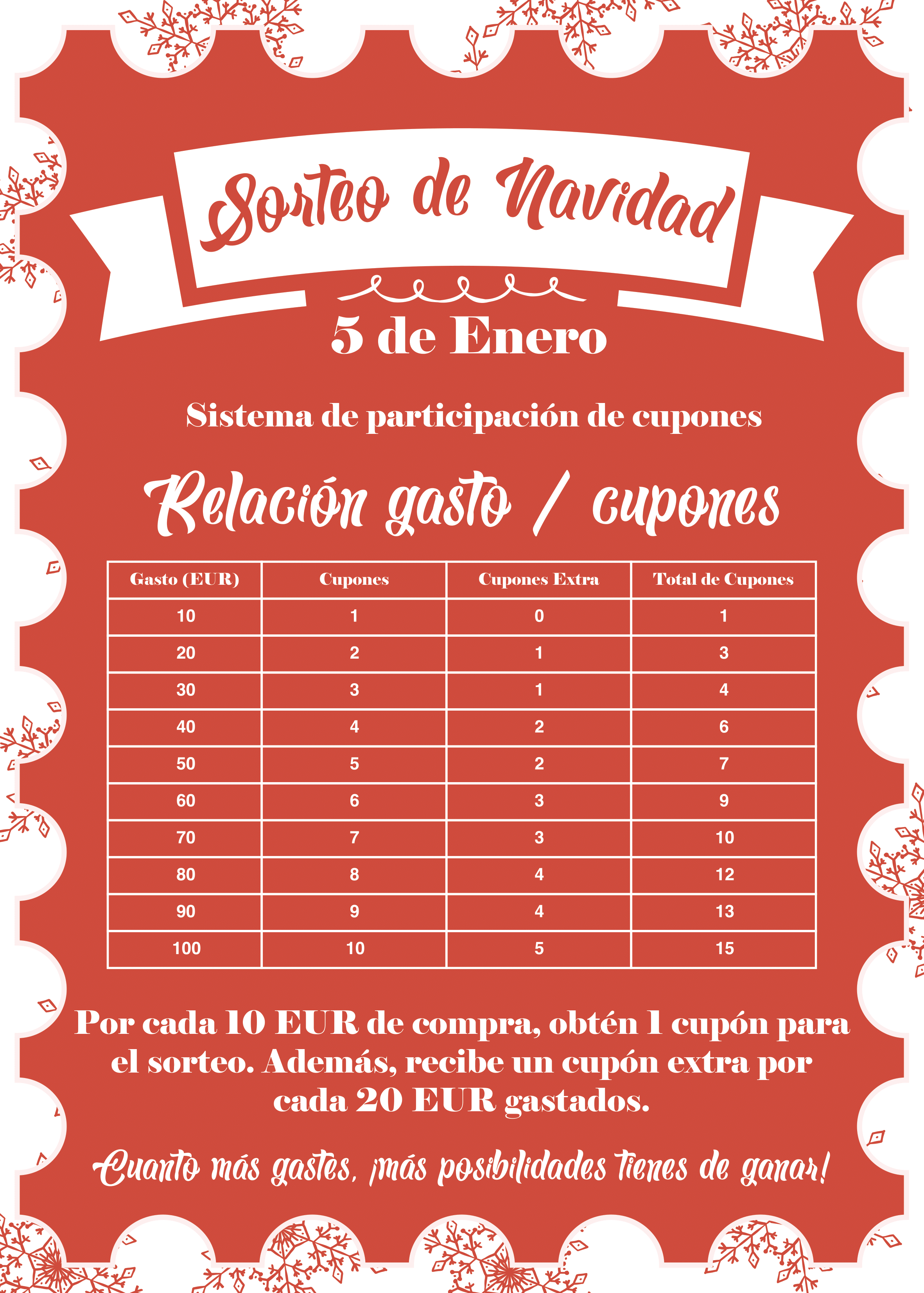 Por cada 10€ que gastes, recibirás un cupón para el sorteo, y si tu compra alcanza los 20€, obtendrás un cupón extra para aumentar tus posibilidades de ganar.