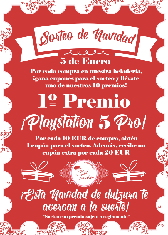 ¿Quieres hacer de esta Navidad una ocasión inolvidable? Con cada compra en nuestra heladería, no solo te llevas el mejor sabor, ¡también tienes la oportunidad de ganar increíbles premios! Por cada 10 EUR que gastes, recibirás un cupón para participar en nuestro gran sorteo de Navidad, y si alcanzas los 20 EUR, ¡obtendrás un cupón extra!