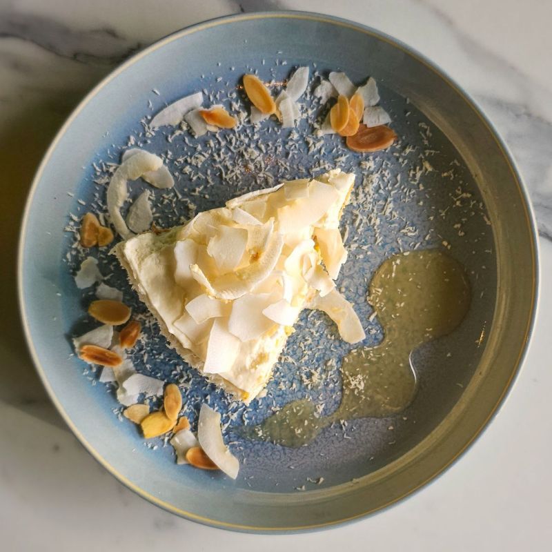 Delicado bizcocho blanco aromatizado con Malibu, gel de coco, crema de chocolate blanco con quebradizo de almendras y avellanas, coco en polvo y hojuelas. ¡Aquí vas directo al paraíso!