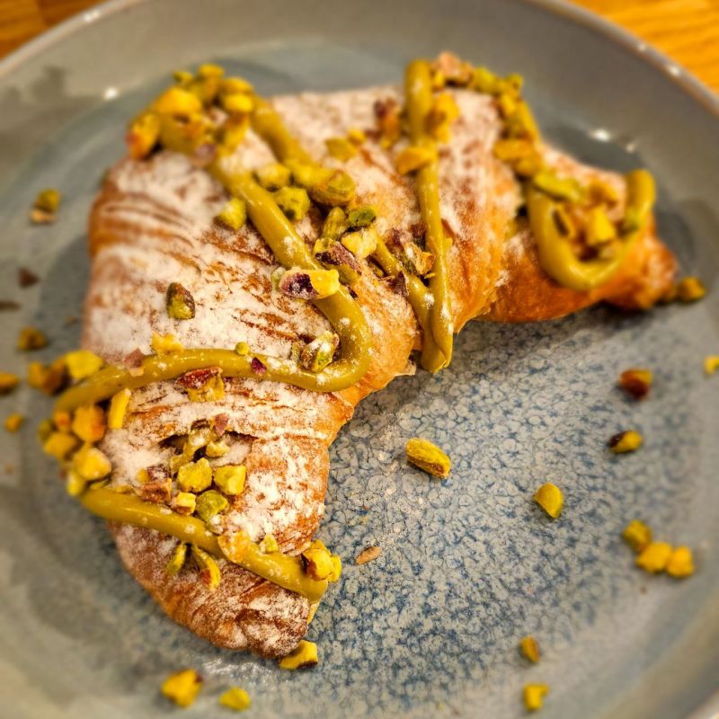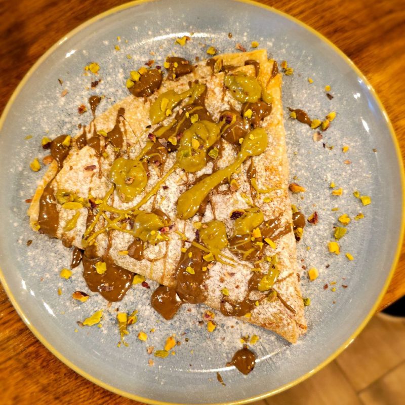 Crepe relleno de crema de pistacho con barquillos crujientes, decorado por fuera con salsa de pistacho con pistachos enteros tostados y caramelizados. ¡Más allá del placer!