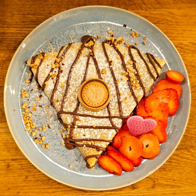Nuestro crepe más vendido, servido con Nutella y avellanas caramelizadas.