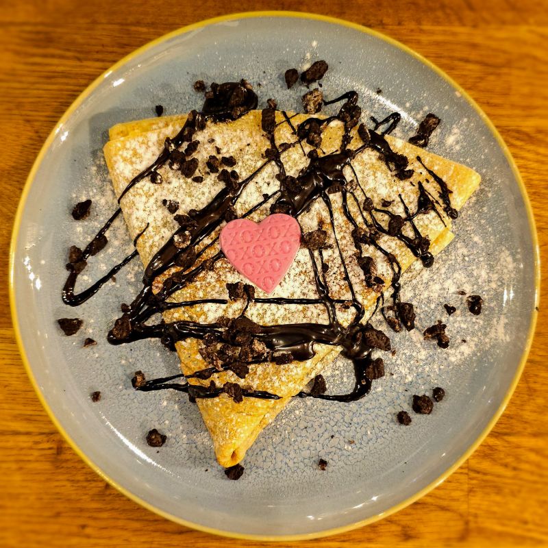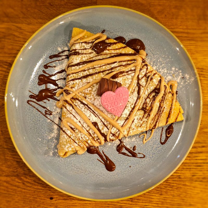 La segunda crepe más vendida, rellena de una sabrosa crema de avellanas con crujientes barquillos, decorada por fuera con salsa bueno clara y oscura.