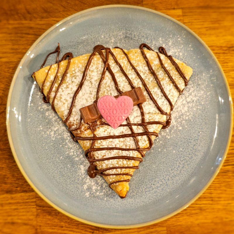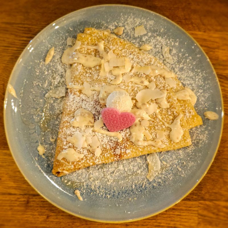 Nuestra crepe más romántica y exótica, con crema de chocolate blanco y crujiente de almendras y avellanas. ¡Aumenta los latidos de tu corazón!