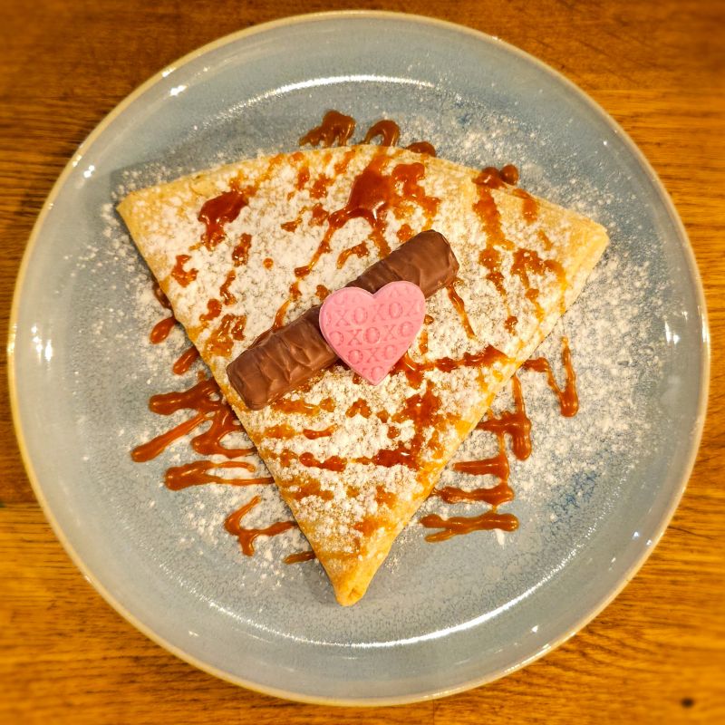 Para los amantes de esta sabrosa barra, nuestra crepe rellena de caramelo salado, hecho de manera artesanal, y trozos de Twix.