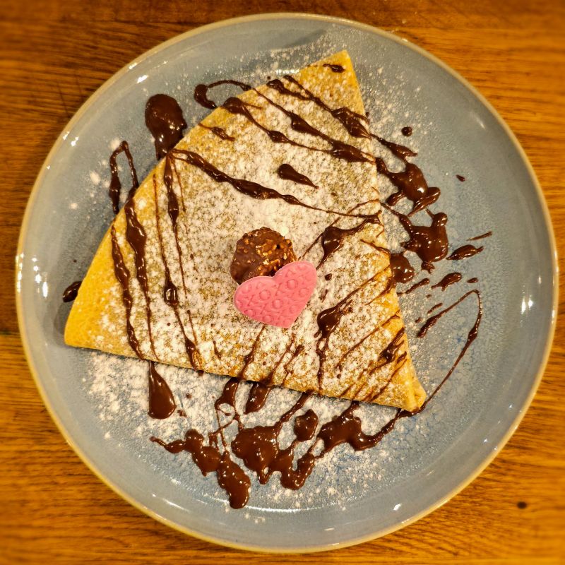 Nuestro crepe relleno de crema de gianduia con crujiente de avellanas caramelizadas.